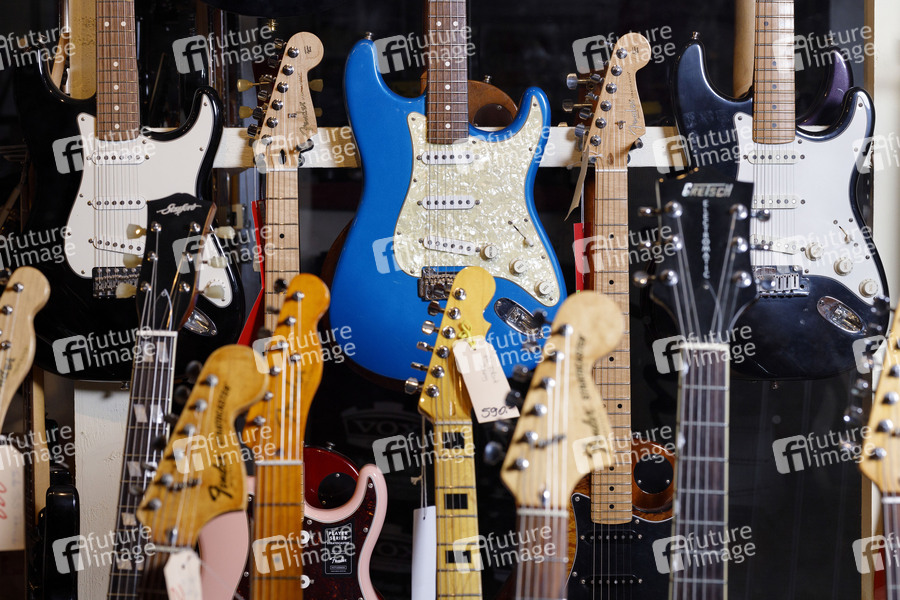 Gitarren in einem Fachgeschäft für Musikinstrumente. Köln, 28.03.2020