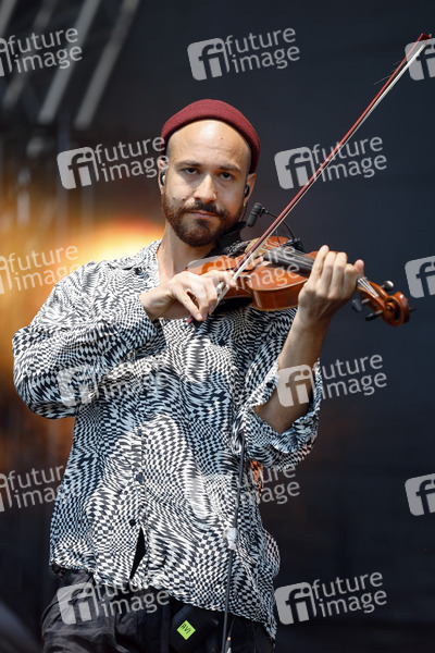 Daniel Avi Schneider von der Band Bukahara live im Kulturgarten in der Bonner Rheinaue. Das Bonn Live Kulturgarten Open Air Festival 2020 ist Europas erstes Open Air Musik Festival unter Corona-Auflagen wegen der Covid-19 Pandemie. Bonn, 21.07.2020