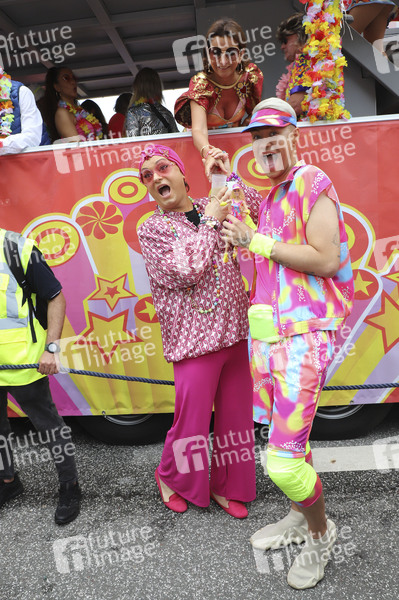Julian F.M. Stoeckel, Claudia Obert und Marcell Damaschke beim 26. Schlagermove 2024 auf dem Heiligengeistfeld. Hamburg, 25.05.2024