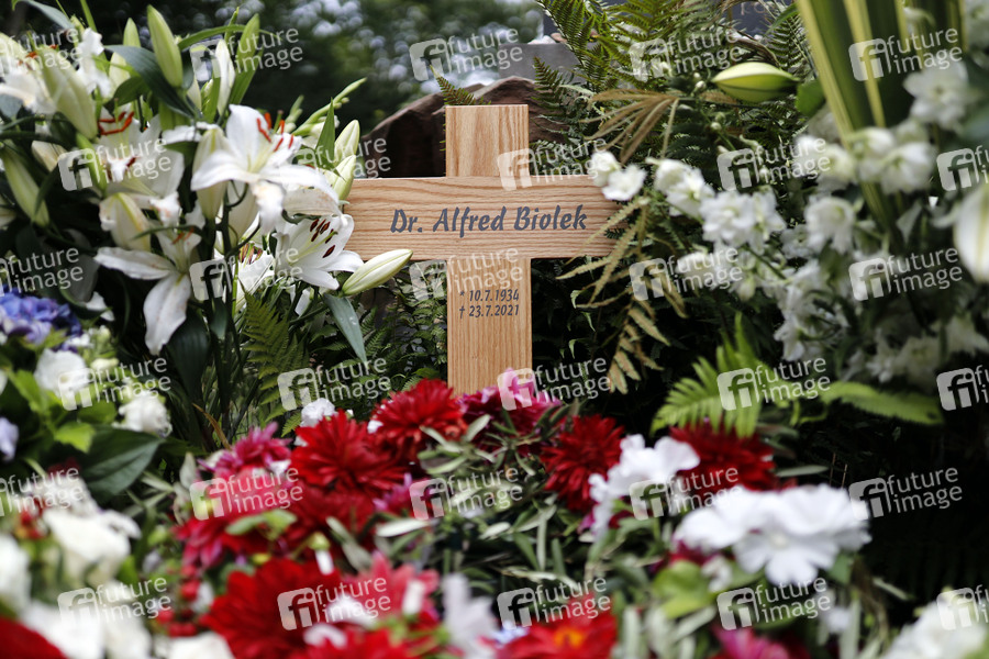 Ein Holzkreuz markiert das Grab von Dr. Alfred Biolek auf dem Melaten Friedhof. Die Urne mit Bioleks Asche war am Freitag im engsten Familienkreis beigesetzt worden. Die Grabstätte gehört der Familie Gruber, mit der Biolek eng befreundet war. Köln, 09.08.2021