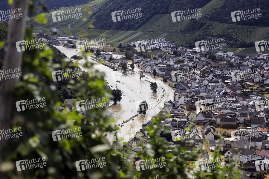 In der Eifel haben heftige Regenfälle und Dauerregen für Überschwemmungen und Überflutungen gesorgt. Im Ahrtal trat der Fluss vielerorts über die Ufer und überschwemmte nicht nur Keller sondern ganze Ortschaften. Im Bild der Ort Dernau (Landkreis Ahrweiler), der beinahe komplett von den Wassermassen geflutet wurde. Viele Menschen verloren alles. Dernau, 15.07.2021