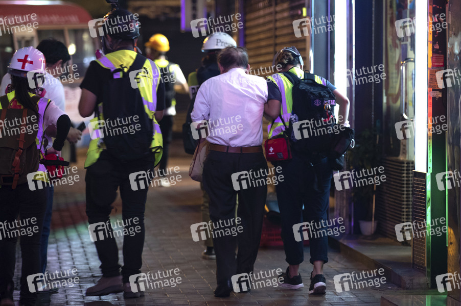 Sanitäter helfen von Tränengas verletzten Bürgern im Tsuen Wan Bezirk. Sonntagskämpfe zwischen Demonstranten und Polizei finden in und um Einkaufszentren in verschiedenen Stadtteilen statt. Es ist der fünfte Monat in Folge, seitdem in Hongkong die Proteste andauern, die durch ein nun zurückgezogenes Auslieferungsgesetz ausgelöst wurden. Dieser Protest hat sich jedoch zu einer breiteren Forderung nach demokratischen Reformen und unabhängigen polizeilichen Ermittlungen sowie zu anderen Forderungen entwickelt. Carrie Lam erlies ein Verbot der Gesichtsbedeckung mit Wirkung zum 5. Oktober. Bürger versammeln sich in verschiedenen Einkaufszentren und Stadtteilen, um zu protestieren. Hongkong, 10.11.2019