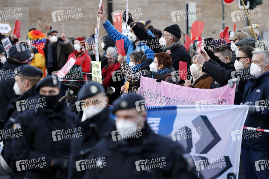 Gegendemonstranten aus dem linken Spektrum halten rote Karten in die Höhe und Banner und Schilder mit Aufschriften wie 'Antiverschwurbelte Aktion', 'Omas gegen Rechts' oder 'Ihr seid nicht das Volk'. Bei einer angemeldeten Demo unter dem Motto 'Wir alle gemeinsam - Freie Impfentscheidung' demonstrierten etwa 12.000 Gegner einer Impfpflicht mit einem Spaziergang gegen die Corona-Maßnahmen der Bundesregierung und für eine individuelle Impfentscheidung, Grundrechte und 'unversehrte' Kinder - darunter auch viele Pflegekräfte, die wegen der Impfpflicht im Gesundheitsbereich ihren Job zu verlieren drohen. Düsseldorf, 12.02.2022