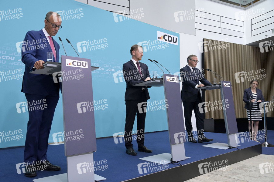 Friedrich Merz, Michael Kretschmer und Mario Voigt bei der Pressekonferenz der CDU nach den Landtagswahlen in Thüringen und Sachsen im Konrad-Adenauer-Haus. Berlin, 02.09.2024