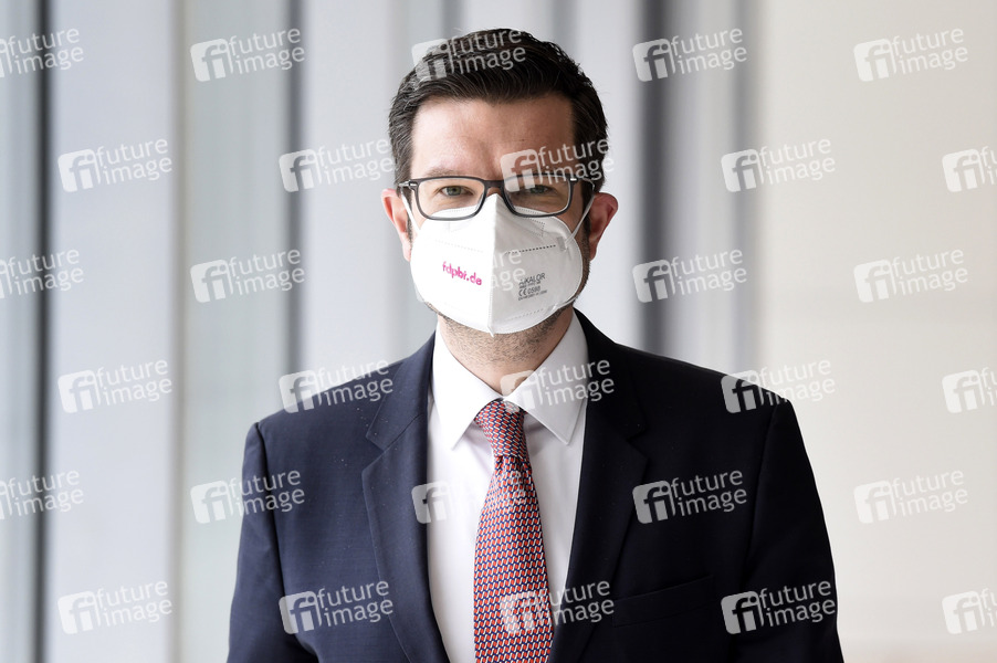 Marco Buschmann bei einem Pressestatement der FDP vor der Fraktionssitzung auf der Fraktionsebene im Reichstagsgebäude. Berlin, 04.05.2021