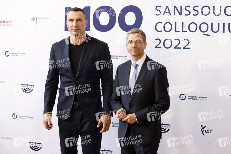 Wladimir Klitschko und Mike Schubert bei der Verleihung des M100 Media Award 2022 für das ukrainische Volk in der Orangerie Sanssouci. Potsdam, 15.09.2022
