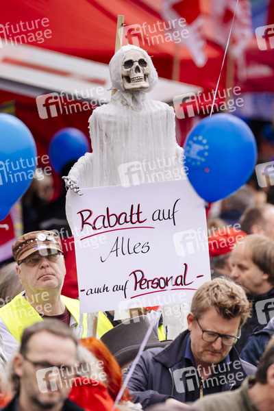 Mai-Demo, Mai-Demonstration, Tag der Arbeit, Mai-Demonstranten, Demo, Demonstranten, Maidemo, Maidemonstranten, Maidemonstration, 1. Mai, Erster Mai, Tarif, Tariflohn, Gewerkschaft, Gewerkschaften, Streik, Tarifflucht, Gewerkschaftsbund, Tarifstreit, IGM, IG Metall, Verdi, Linke, MLPD, DGB, Lohnkosten, Niedriglohn, Klimaschutz, Demo-Schilder, Protestschilder, Lohnkosten, Skelett, Gerippe, Schreckgespenst, Symbolbild, Symbolfoto