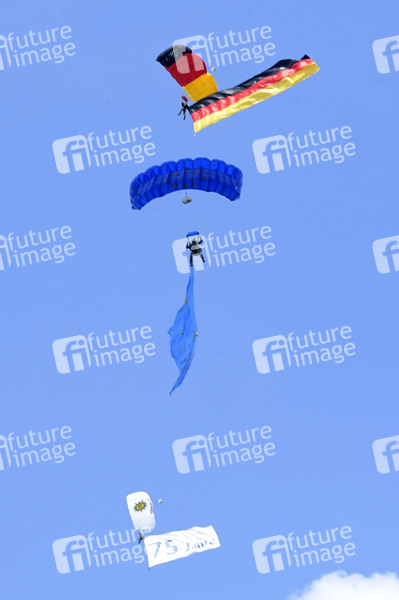 Fallschirmspringer beim Staatsakt zu 75 Jahre Grundgesetz auf dem Forum zwischen Bundestag und Kanzleramt. Berlin, 23.05.2024