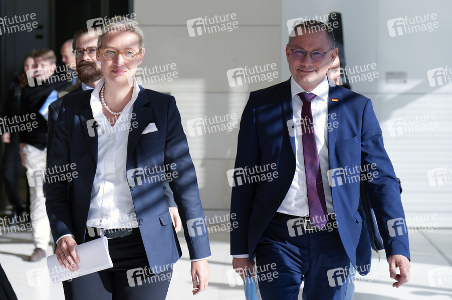 Alice Weidel und Tino Chrupalla bei der Fraktionssitzung der AfD-Bundestagsfraktion im Reichstagsgebäude. Berlin, 15.10.2024
