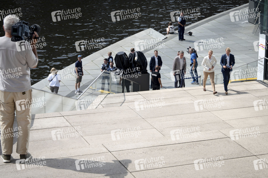 Alice Weidel und Markus Preiß beim ARD-Sommerinterview auf der Terrasse vom Marie-Elisabeth-Lüders-Haus. Berlin, 20.07.2025