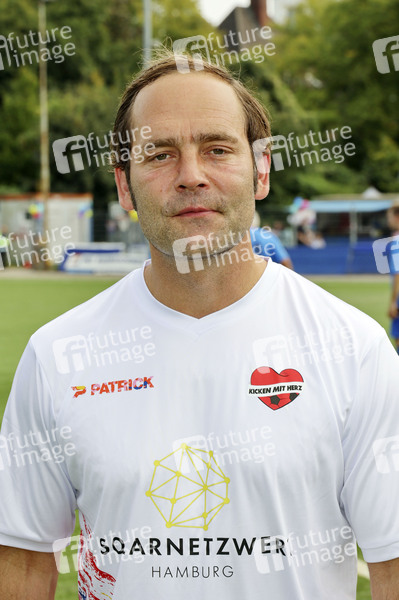 Axel Bosse beim Benefiz-Fußballspiel 'Kicken mit Herz' 2024 zu Gunsten des Herzzentrums des UKE im Stadion des SC Victoria. Hamburg, 08.09.2024