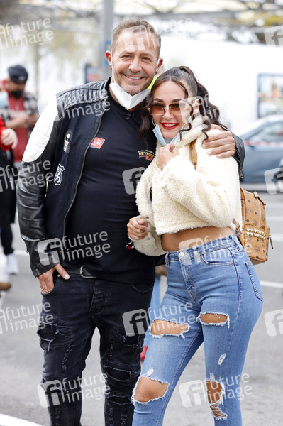 Willi Herren mit Tochter Alessia Herren bei der Eröffnung von 'Willi Herren's Rievkooche Bud'. Willi Herren stellt seinen Reibekuchen-Truck am Gelände der Selgros vor. Köln, 16.04.2021