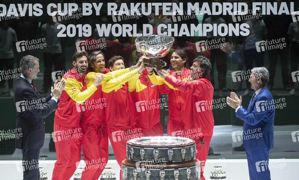 Felipe von Spanien, Marcel Granollers, Feliciano Lopez, Pablo Carreno Busta, Roberto Bautista Agut, Rafael Nadal und Sergi Bruguera beim Davis Cup Finale 2019 Spanien gegen Kanada im Sportkomplex Caja Mágica. Madrid, 24.11.2019