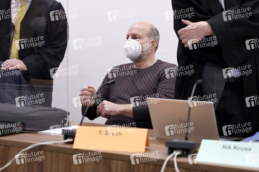 Der Angeklagte Thomas Drach bei seinem Strafprozess vor dem Kölner Landgericht. Der 61-jährige frühere Reemtsma-Entführer soll vier Geldtransporter in Köln, Frankfurt am Main und Limburg überfallen haben. Die Anklage lautet unter anderem auf versuchten Mord und besonders schweren Raub. Der Prozess findet unter aufwendigen Sicherheitsvorkehrungen statt. Köln, 07.02.2022