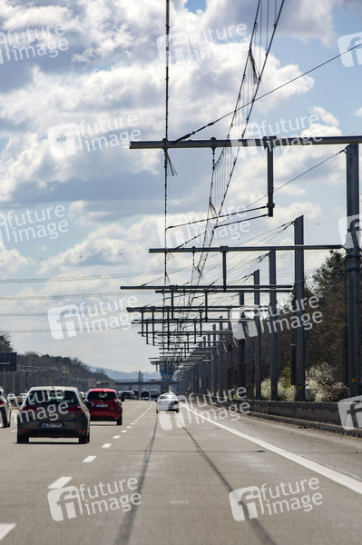 Oberleitungen über der rechten Fahrspur auf dem eHighway für den elektrifizierten Straßengüterverkehr auf der A5 zwischen Langen/Mörfelden und Weiterstadt im Rahmen des Projektes 'Elektromobilität bei schweren Nutzfahrzeugen zur Umweltentlastung von Ballungsräumen'. Mörfelden-Walldorf, 04.04.2021