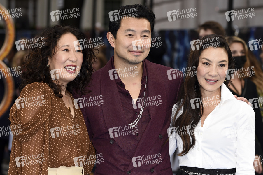 Sandra Oh, Simu Liu und Michelle Yeoh bei der Premiere des Kinofilms 'Shang-Chi and the Legend of the Ten Rings' im Curzon Mayfair Cinema. London, 26.08.2021