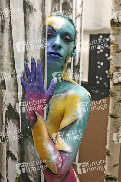 Bodypainting und Fotoshooting mit Model Sarah am Tag der offenen Tür der Meisterschule Justus-von-Liebig-Schule, Abteilung Floristik in Hannover-Ahlem. Künstler: Jörg Düsterwald