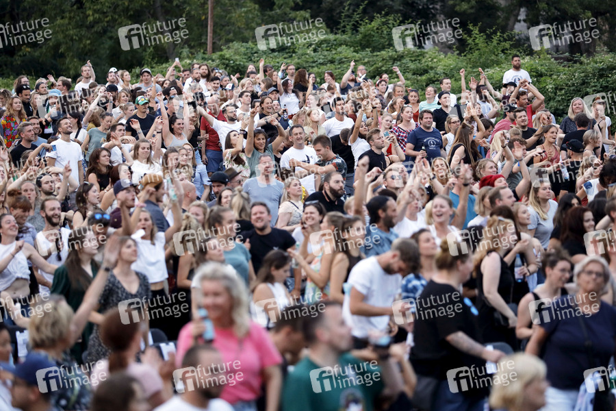 Publikum bei einem Benefizkonzert an der Südbrücke zugunsten der Opfer des Jahrhunderthochwasser in der Eifel. Auftritte und Gastronomie finden unter Corona-Auflagen wegen der Covid-19 Pandemie statt. Ab einer Inzidenz von 50 gilt in Köln wieder: Es dürfen nur 500 getestete Personen in Konzerte, Kinos und Theater innen unter Einhaltung von Mindestabstand. (Themenbild, Symbolbild) Köln, 12.08.2021