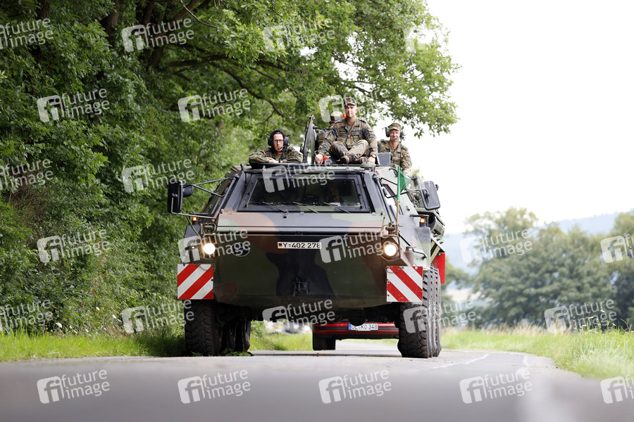 Armin Laschet und Horst Seehofer besuchen die Steinbachtalsperre im Kreis Euskirchen, um sich ein Bild von der angespannten Lage am Damm zu machen und den Helfern von Polizei, THW, Bundeswehr und Feuerwehr für ihren unermüdlichen Einsatz zu danken. Im Bild Soldaten der Bundeswehr. Kirchheim, 19.07.2021