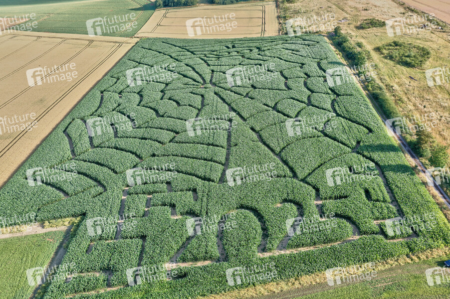 Maisfeld, Feld, Landwirtschaft, Labyrint, Freizeit, Familiespaß, Ausflugziel, temporärer Irrgarten, Freizeiteinrichtung, Sommervergnügen, Luftaufnahme, Luftbild, Drohne, Drohnenaufnahme