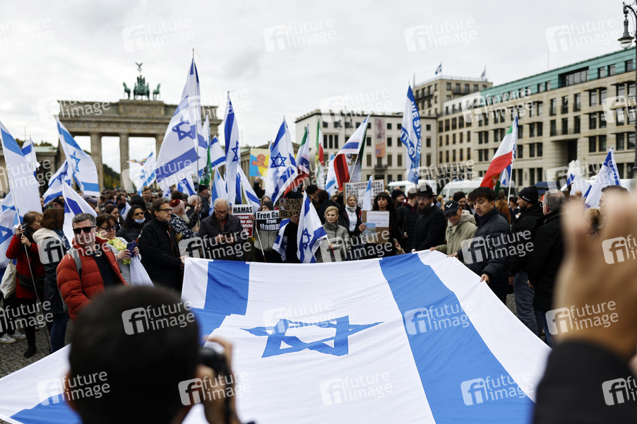 Teilnehmer der Demonstration zum Jahrestag des Hamas-Massakers in Israel unter dem Motto 'Gemeinsam gegen das Verbrechen der Hamas an Israelis und Palästinensern. Für die Freilassung der Geiseln und das Ende der Hamas-Herrschaft in Gaza.' vom Brandenburger Tor zum Bebelplatz. Berlin, 06.10.2024