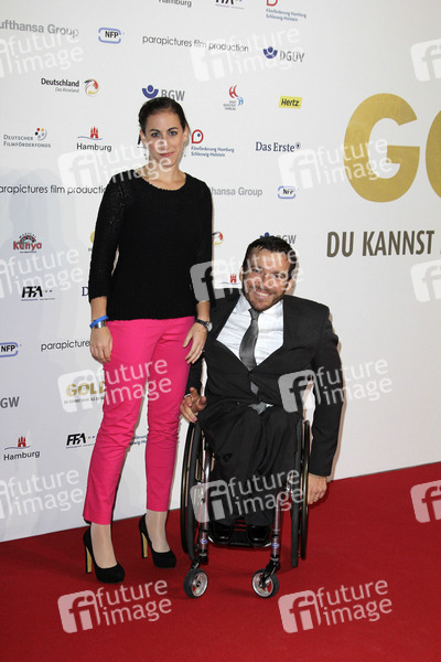 Kurt Fearnley mit Ehefrau Sheridan Fearnley bei der Premiere von 'Gold - Du kannst mehr als du denkst' im Hangar Nr. 6 der Lufthansa Technik. Hamburg, 26.02.2013