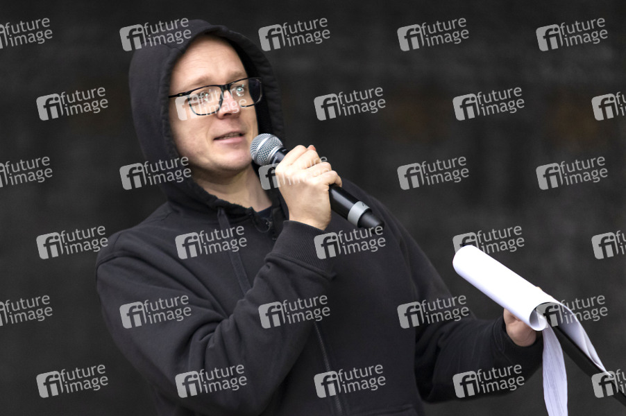 Nico Semsrott bei der PRÜF! - Auftakt-Demo zum Start einer Kampagne für die Prüfung aller als rechtsextrem eingestuften Parteien. Hamburg, 08.11.2025
