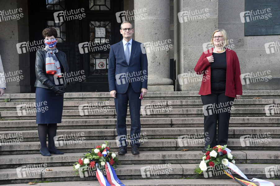 Robin S. Quinville, Michael Müller und Angelika Schöttler beim Gedenkmoment zum 12 Uhr-Glockenschlag der Freiheitsglocke im Turm des Schöneberger Rathauses mit Gebindeniederlegung aus Anlass des 70-jährigen Jubiläums des ersten Glockenschlags vor dem Rathaus Schöneberg. Berlin, 24.10.2020