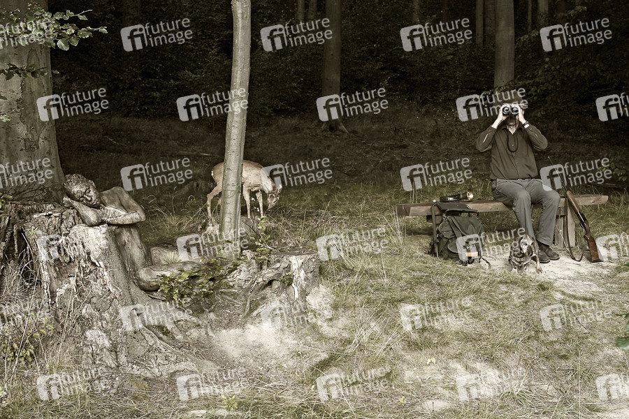 Bodypainting, Body-Painting, Erotik, Frau, Mädchen, nackt, Akt, weiblich, Körperkunst, Körperfarben, Farbe, Bemalung, Kunst, Malerei, Wald, Jäger, Reh, Hund, Dackel, Jagd, Natur, Baumwurzel, Baumstumpf, draußen, body painting, erotic, woman, girl, nude, female, body art, colors, forest, hunter, deer, dog, dachshund, hunting, nature, tree root, stump, outside, Joerg Duesterwald