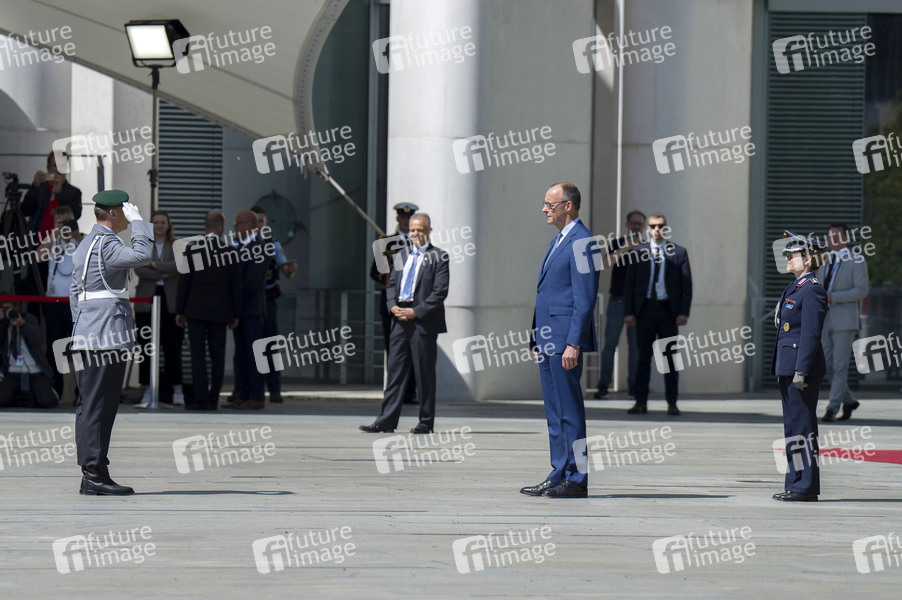 Friedrich Merz beim Empfang des Ministerpräsidenten von Griechenland mit militärischen Ehren und zu einem gemeinsamen Gespräch mit anschließendem Pressestatement im Bundeskanzleramt. Berlin, 13.05.2025
