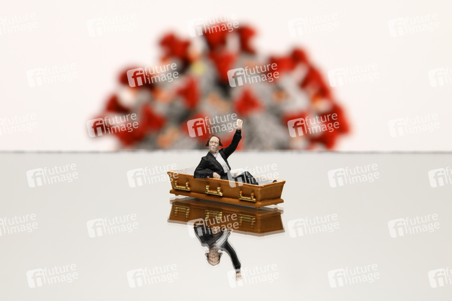 Ein Toter in einem Sarg winkt. Im Hintergrund eine Grafik des Coronavirus der US-Behörde CDC unter public domian.
