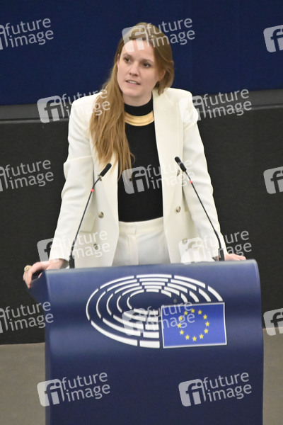 Terry Reintke bei einer Plenartagung mit Laufenden Anhörungen gemäß Artikel 7 Absatz 1 EUV zu Polen und Ungarn im Plenarsaal des Europäischen Parlaments. Straßburg, 06.04.2022