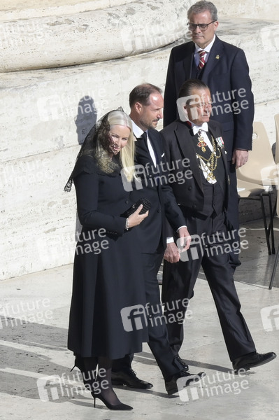 Kronprinz Haakon von Norwegen mit Ehefrau Mette-Marit Kronprinzessin von Norwegen bei der Trauermesse für den verstorbenen Papst Franziskus auf dem Petersplatz. Vatikanstadt, 26.04.2025