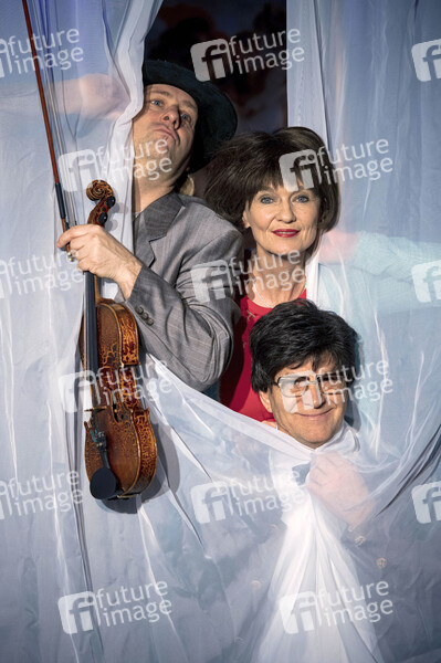 Florian Mayer, Josephine Hoppe und Dirk Neumann in der Theatervorstellung 'Das Ei ist hart! Ein Loriot-Abend' in Hoppes Hoftheater. Dresden, 16.01.2022