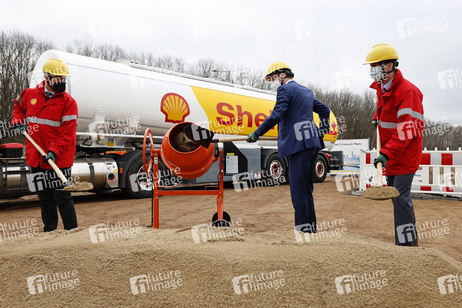 Geschäftsführer von Shell Deutschland, Manager, General Manager, Manager des Energy und Chemicals Park Rheinland, Politiker, CDU, Union, Ministerpräsident des Landes Nordrhein-Westfalen, NRW-Ministerpräsident, Auftritt, Shell, Industrie, Raffinerie, Royal Dutch Shell, Produktionsanlage, Gaskonzern, Gasindustrie, Ölindustrie, Ölkonzern, Treibstoff, Klimaziele, Förderung, Energiewende, Chemieindustrie, Kohlendioxid-Ausstoß, Gas, Erneuerbare Energien, Umweltschutz, Energietechnik, Umweltpolitik, Gaspreis, Gaspreise, Industriepolitik, Energiepolitik, Shell Energy, Chemicals Park Rheinland, CO2-neutral, Nachhaltigkeit, CO2-Neutralität, Biogas, Bio-Gas, Bio-LNG, flüssiges Gas, Biomethan, Methangas, Methan-Gas, Baustelle, Spatenstich, Helm