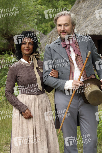 Dennenesch Zoude und Stephan Grossmann beim Pressefototermin am Set des Märchenfilms 'Das Märchen vom goldenen Taler' für die ARD-Märchenreihe 'Sechs auf einen Streich' im Museumsdorf Düppel. Berlin, 08.07.2020
