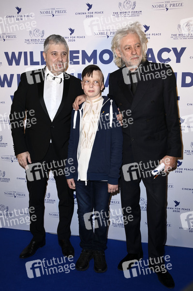 Evgeny Afineevsky / Jewgeni Afinejewski, Roman Oleksiv und Bob Geldof bei der Cinema For Peace Gala 2026 im Hotel Adlon Kempinski. Berlin, 16.02.2026