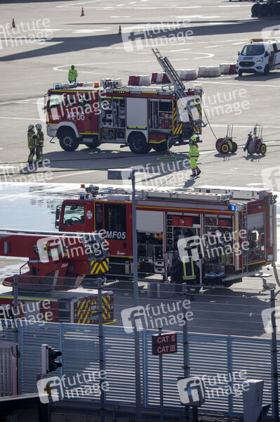 Feuerwehreinsatzfahrzeuge und Einsatzkräfte bei der Notfallübung der Werkfeuerwehr, der Feuerwehr Köln und den Hilfsorganisationen am Flughafen Köln/Bonn. Im Rahmen der Übung wird die Kollision eines Flugzeugs mit einem Passagierbus und einer Abfertigungshalle simuliert. Einsatzkräfte retten aus dem in Brand geratenen Flugzeug und dem Gebäude Personen und versorgten diese. Köln, 06.11.2021