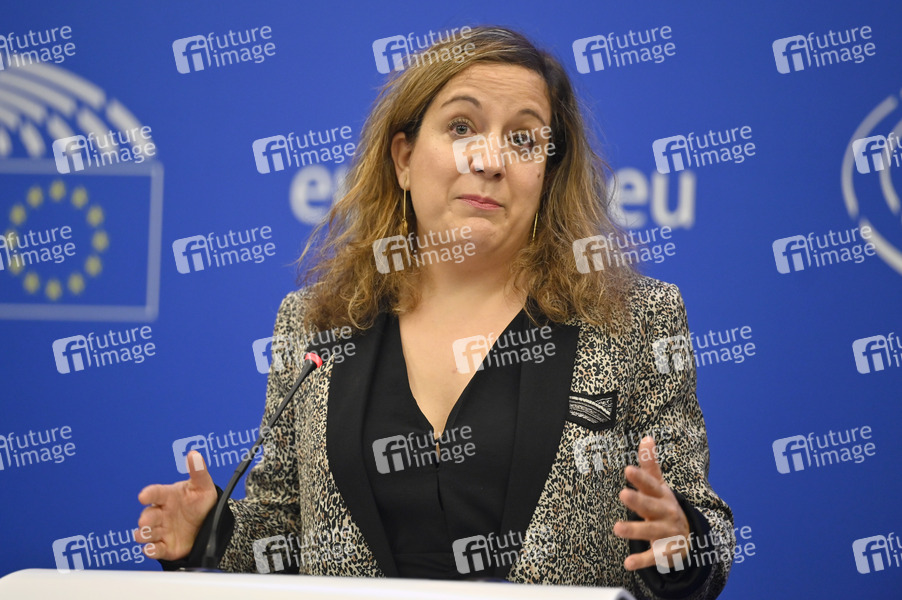 Iratxe García Pérez, Pressekonferenz, PK, Pressestatement, Strasbourg, Europaparlament, EU-Parlament, EP, Parlament der Europäischen Union, Parlamentum Europaeum, Mitglied des Europäischen Parlaments, Politikerin, Spanien, PSOE, Vorsitzende der Fraktion der Progressiven Allianz der Sozialdemokraten
