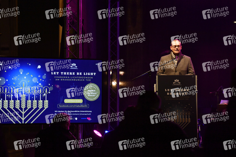 Michael Müller beim Zünden der ersten Kerze am Chanukka-Leuchter anlässlich der beginnenden Chanukka-Feiertage am Brandenburger Tor. Berlin, 10.12.2020