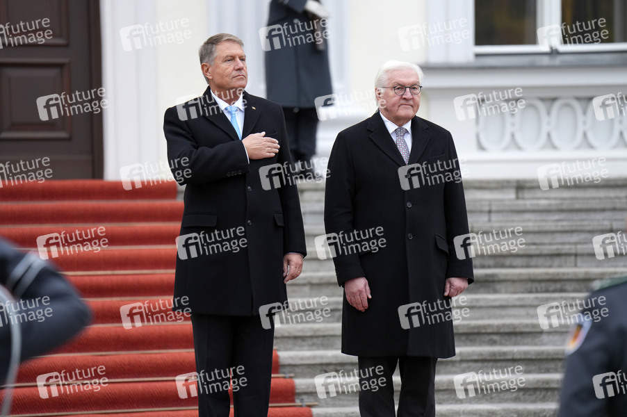 Klaus Iohannis und Frank-Walter Steinmeier beim Empfang des Präsidenten von Rumänien mit militärischen Ehren und zum gemeinsamen Gespräch im Schloss Bellevue. Berlin, 16.11.2024