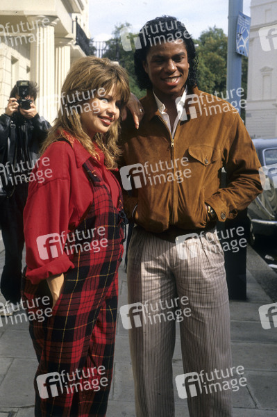 Pia Zadora und Jermaine Jackson beim Photocall vor einem Hotel. London, 10.09.1984