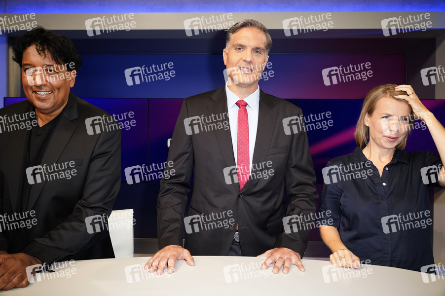 Cherno Jobatey, Frederik Pleitgenund Helene Bubrowski in der ARD-Talkshow 'maischberger' im Studio Berlin Adlershof. Berlin, 28.08.2024