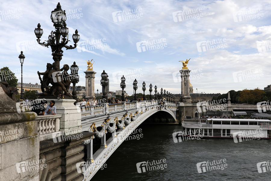 Der Pont Alexandre III ist eine im Stil des Neobarocks errichtete Brücke über die Seine in Paris. Er gilt als eindrucksvollste und auch kühnste Bogenbrücke ihrer Epoche und ist mit zahlreichen dekorativen Elementen wie Löwen, vergoldeten Figuren oder Pylonen versehen. Paris, 29.07.2019