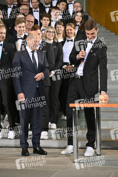 Der Zimmerer und Silbermedaillengewinner Philipp Kaiser überreicht dem Bundeskanzler einen aus sechs verschiedenen Hölzern gefertigten Weihnachtsstern beim Empfang der Deutschen Berufe-Nationalmannschaft im Bundeskanzleramt. Deutschland erzielte beim WorldSkills-Wettbewerb, der erstmals dezentral in 15 Nationen auf der ganzen Welt ausgetragen wurde, das beste Ergebnis seit mehr als 17 Jahren. Berlin, 08.12.2022
