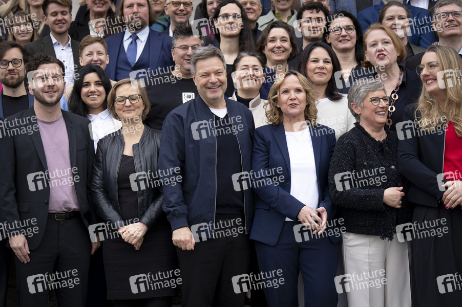 Robert Habeck beim Gruppenfoto der neuen Bündnis 90/Die Grünen Fraktion nach der Fraktionssitzung der Bündnis 90/Die Grünen-Bundestagsfraktion auf der Treppe zum Reichstagsgebäude. Berlin, 26.02.2025