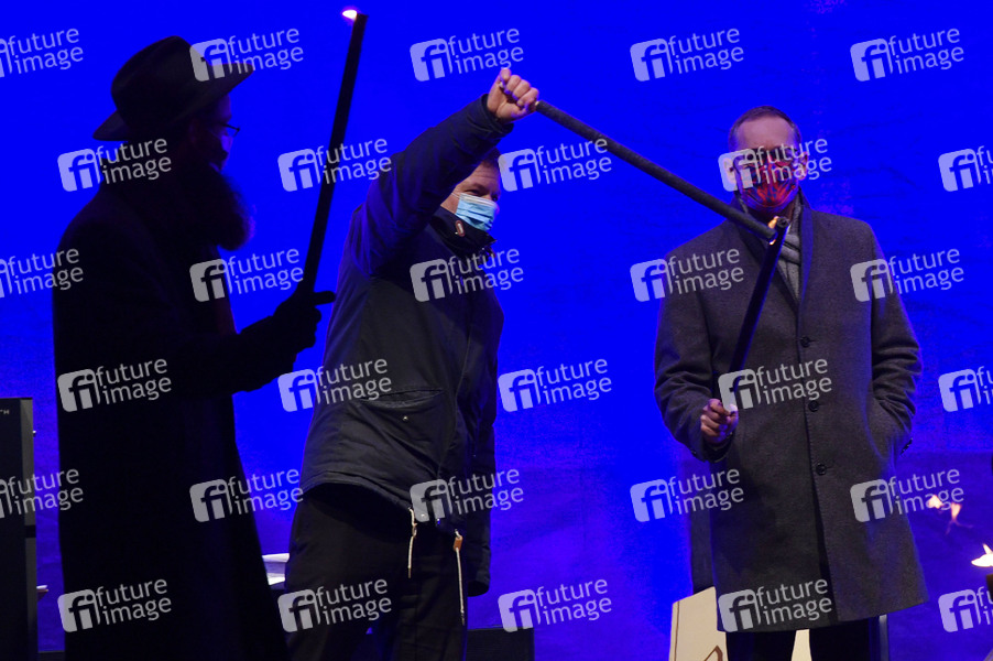 Rabbiner Yehuda Teichtal, Robert Habeck und Michael Müller beim Zünden der ersten Kerze am Chanukka-Leuchter anlässlich der beginnenden Chanukka-Feiertage am Brandenburger Tor. Berlin, 10.12.2020