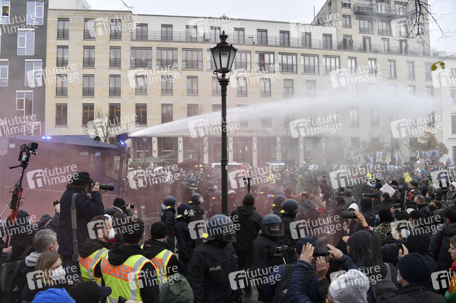 Tausende Demonstranten protestieren am Brandenburger Tor und im Regierungsviertel gegen die Corona-Politik der Regierung. Wegen der massenhaften Verstöße gegen die Hygieneauflagen hat die Polizei die Proteste unter Einsatz von Wasserwerfern beendet. Berlin, 18.11.2020