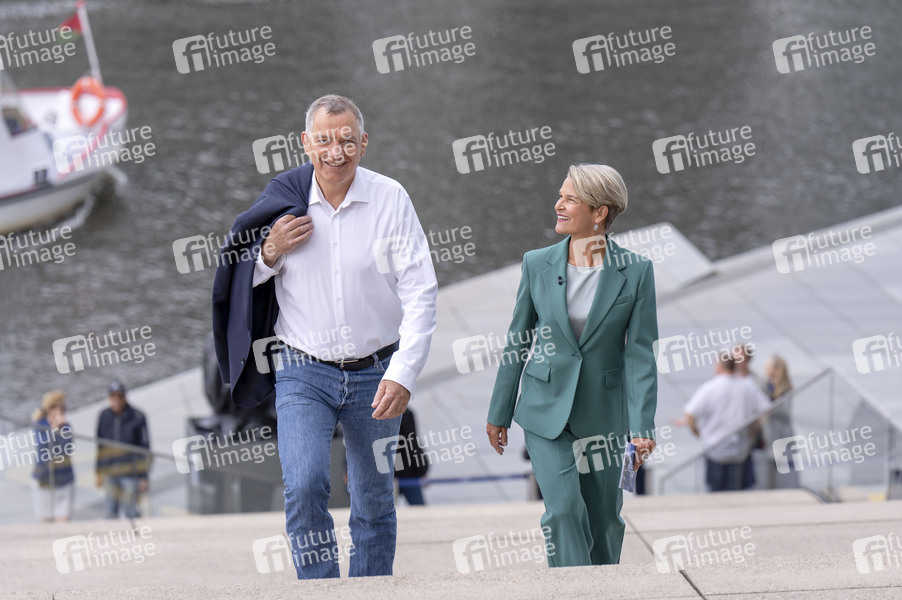 Jan van Aken und Anna Engelke beim ARD-Sommerinterview auf der Terrasse vom Marie-Elisabeth-Lüders-Haus. Berlin, 17.08.2025