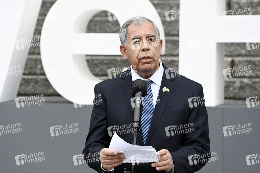 Mickey Levy bei den Pressestatements von Wolfgang Sobotka, Mickey Levy und Bärbel Bas am Schriftzug #WeRemember zur Erinnerung an die Millionen im Nationalsozialismus ermordeten Juden vor dem Reichstagsgebäude. Berlin, 25.01.2022